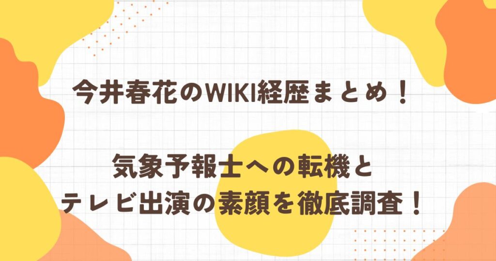 テレビ朝日「グッド!モーニング」でお天気キャスターとして活躍中の今井春花さん。 番組に出演すると「あの可愛いお天気キャスターは誰?」と話題なりました。 この記事では、wiki風の経歴からプロフィール、気象予報士に至る経緯やキャスターの活躍から... -